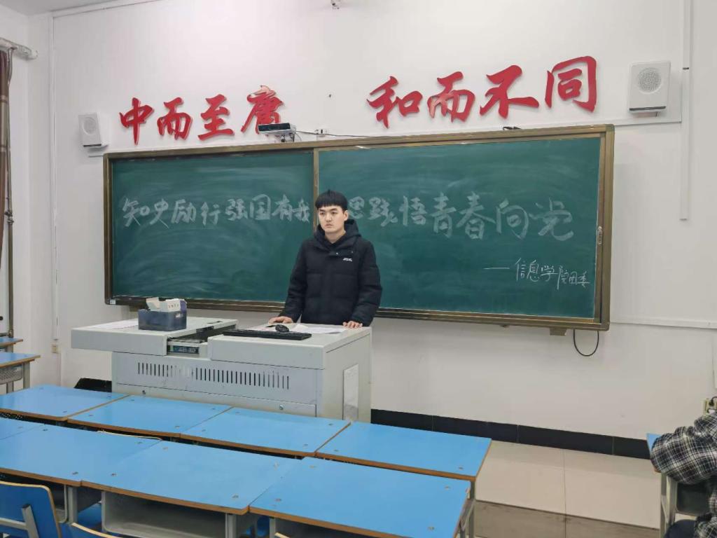为全面贯彻落实党的二十大和二十届三中、四中全会精神,紧密围绕中国人民抗日战争暨世界反法西斯战争胜利80周年这一重大主题,深入学习党的光辉历程与革命传统,不断巩固党史学习教育成果,教育引导广大学子铭记历史、缅怀先烈、珍爱和平、开创未来,2025年11月26日晚6点,信息学院团委于1教1403教室开展“知史励行强国有我,学思践悟青春向党”活动。