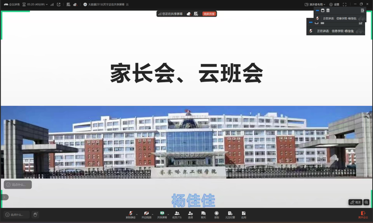 2月25日,为进一步加强家校沟通,统筹做好新学期学生教育管理、毕业就业及安全保障工作,辅导员杨佳佳召开云家长会暨云班会。专业长高敏、韩楠楠以及全体学生及家长共同参会。
