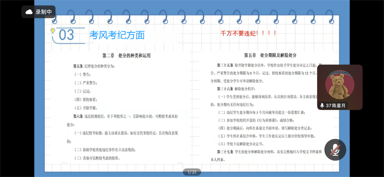 为强化学生考风考纪意识,营造诚信应考、公平公正的校园氛围,引导学生树立正确的考试观念。特此,电子商务22级于3月10日在线上开展考风考纪主题班会。本次班会由辅导员陈星月主持,全体电子商务22级学生参会。
