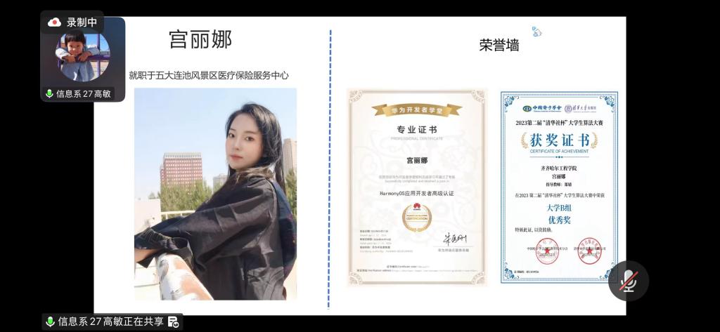 首先,高敏对莅临分享的优秀校友表示热烈欢迎,鼓励同学们珍惜本次朋辈交流的宝贵机会,积极汲取经验、明确方向,为未来求职与升学做好充分准备。随后,宫丽娜进行分享。宫丽娜现就职于五大连池风景区医疗保险服务中心,在校期间便成绩优异、履历亮眼,她围绕“前期准备、备考过程、考试技巧、心态调整”四大核心模块,分享了体制内岗位备考、面试应对的实用经验,用真实案例为同学们提供了可借鉴的求职思路。最后,她结合自身求职经历,从求职方向选择、简历打磨、岗位投递技巧等多个维度,为同学们拆解了求职过程中的关键要点。