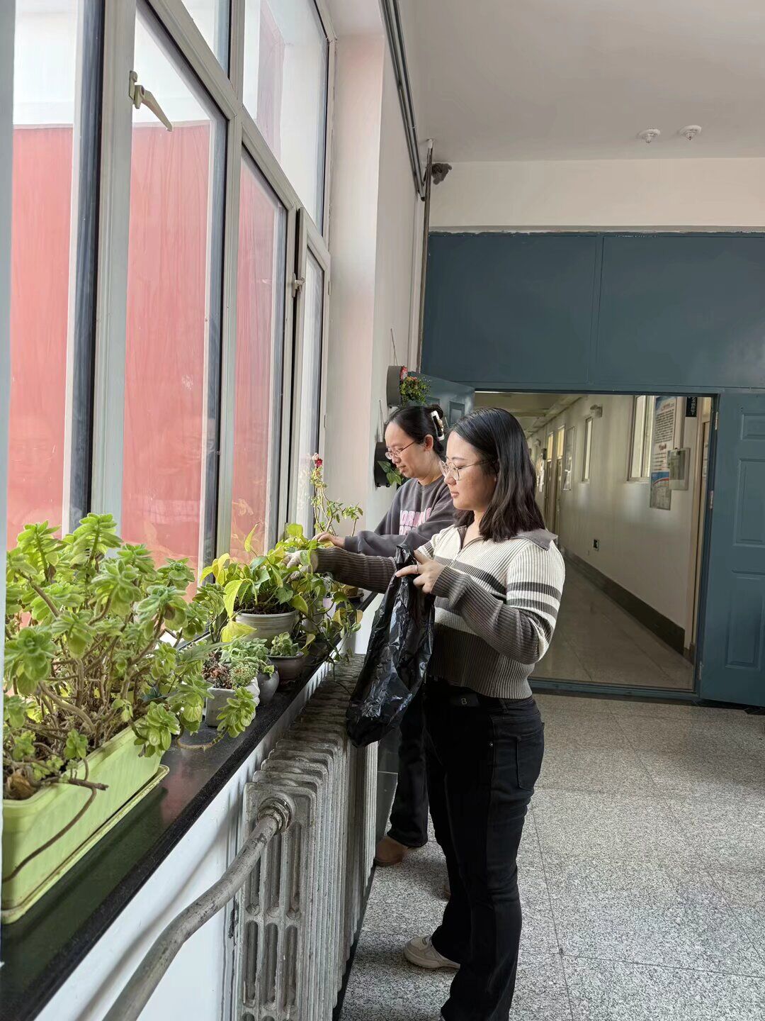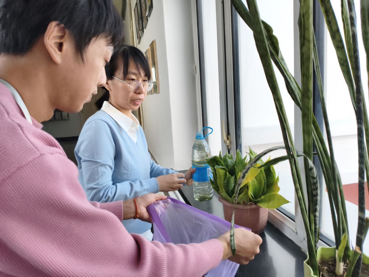 为确保活动扎实开展,计电教师党支部制定了活动方案,划分区域,确定小组,明确分工,统一标准,力求提质增效。同志们热情高涨地投入志愿服务活动中,纷纷拿着抹布、剪刀、垃圾袋等“各司其职”。有的为缺水的花草浇水,有的仔细清理枯枝烂叶,有的擦拭书架、窗台、小桌上的浮灰,有的将书籍等物品摆放整齐。计电教师党支部全体成员发扬不怕脏、不怕累的精神,认真细致地完成每一项任务,用实际行动践行着共产党员的初心使命。