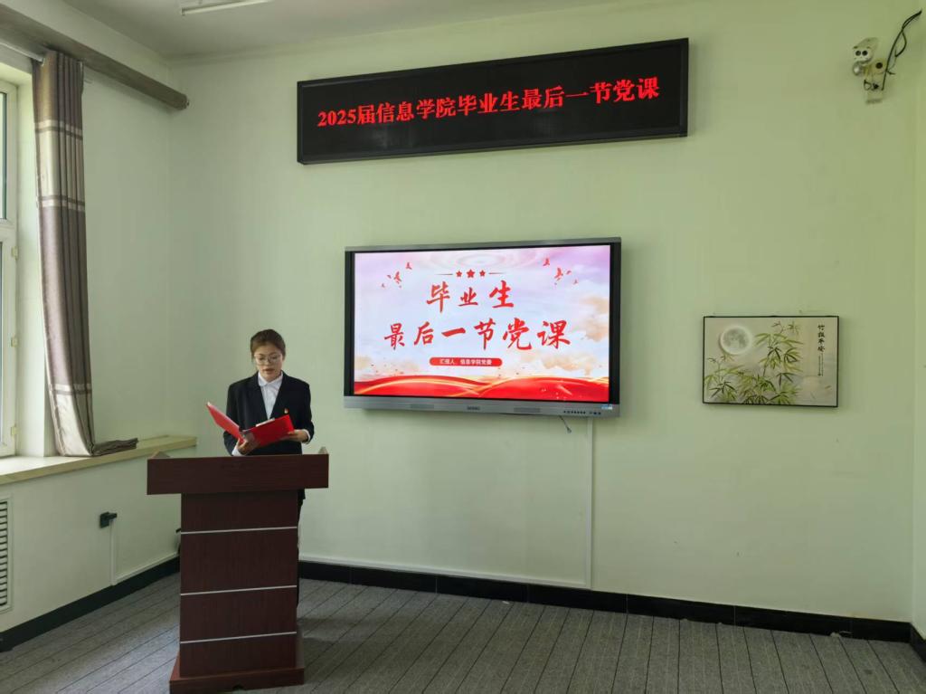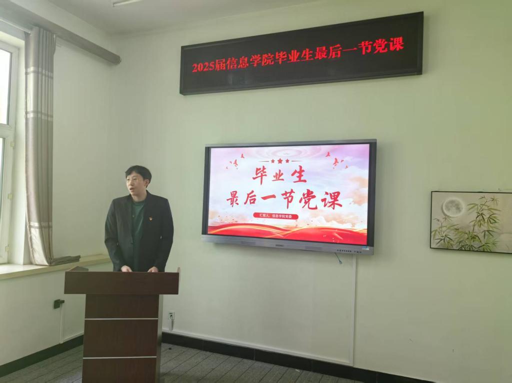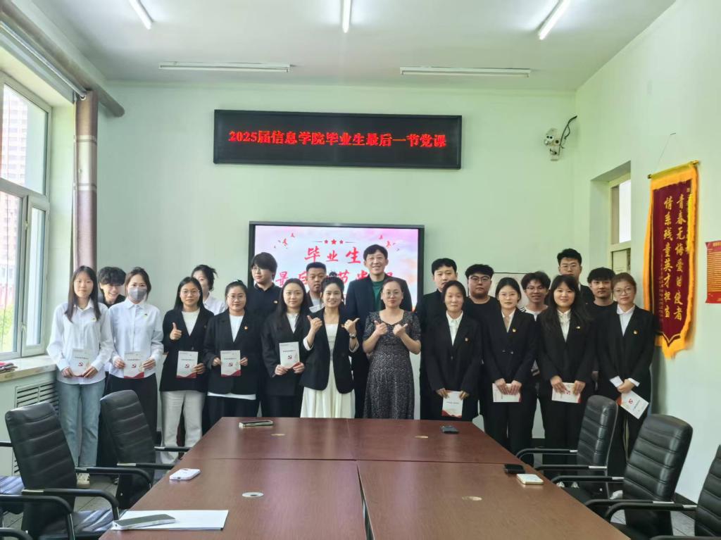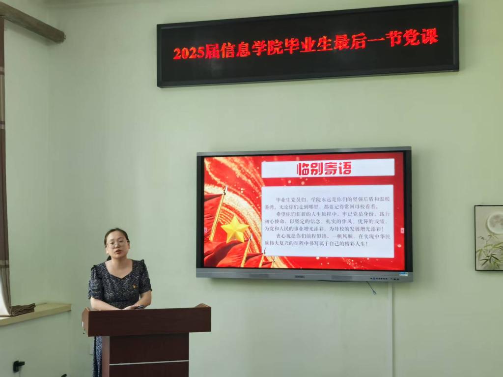 为深化毕业生党员理想信念教育,强化党员身份意识与责任担当,2025年5月29日上午11:00信息学院党委精心筹备并开展了毕业生 “最后一堂党课”。信息学院党委书记李野、党委副书记刘铭炜、组织委员史云辉及全体毕业生党员齐聚一堂,共同接受思想淬炼与精神洗礼。