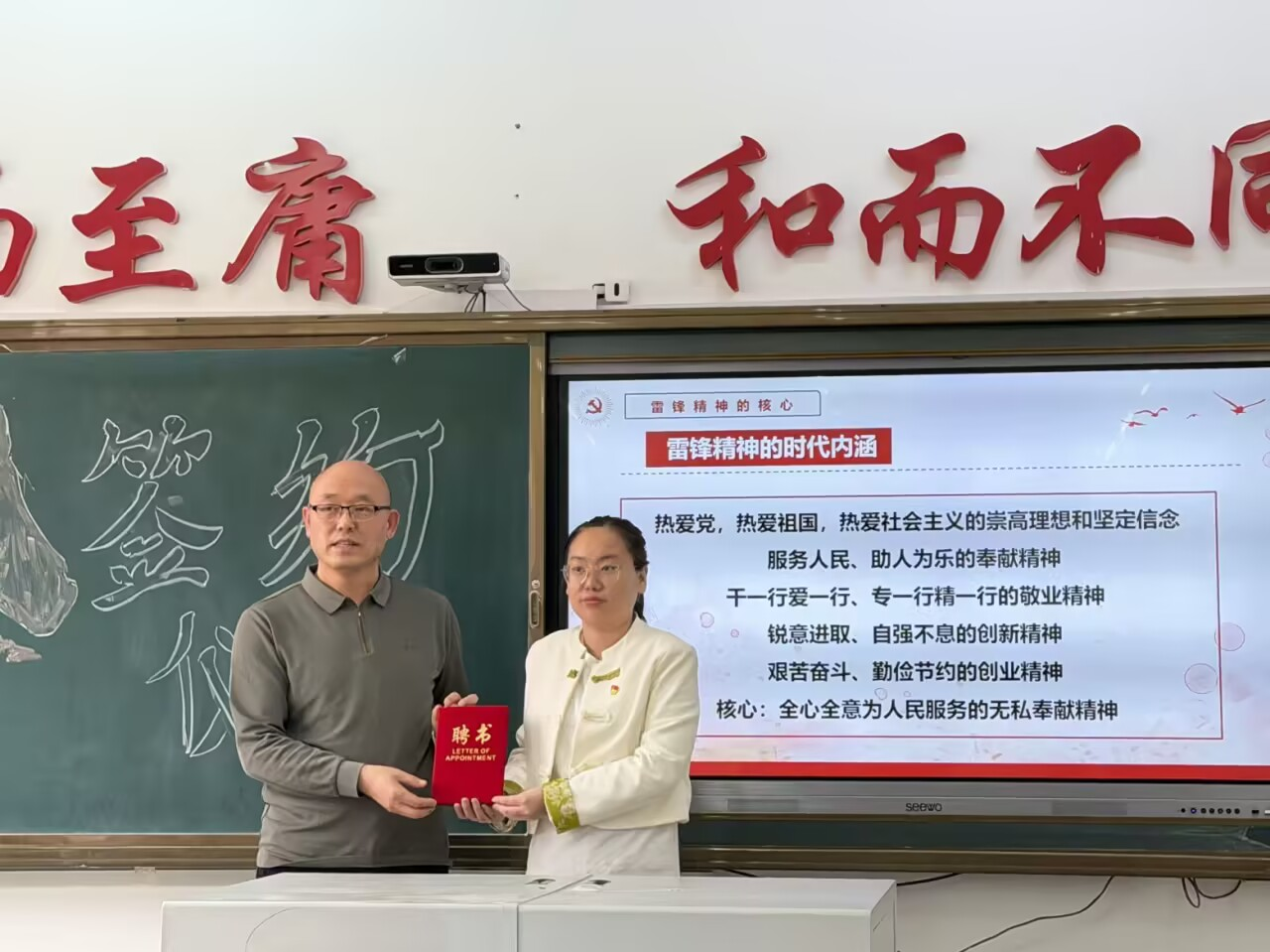 仪式最后,为进一步深化雷锋精神宣讲工作,充分发挥榜样引领作用,经研究决定,正式聘任吕晓岩同志为齐齐哈尔工程学院信息学院、艺术与体育学院雷锋宣讲员。信息学院党委书记李野现场宣读聘任决定,并为吕晓岩同志颁发聘书,双方合影留念,现场掌声雷动,共同见证这一重要时刻。