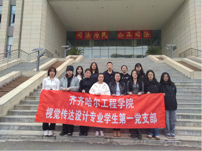 在活动开始,首先由孙晓芳副书记进行介绍此次参观的目的和意义,并简单介绍整体的参观流程。随后,在讲解员的引导下,参观了齐齐哈尔中院宪法墙、员额法官墙、院史馆、科技法庭等场所,亲身感受到了法院的庄严和司法的公开公正,提升了法治思维。最后,视觉传达设计专业学生第一党支部于悦书记带领支部党员在法院们前进行合影留念。