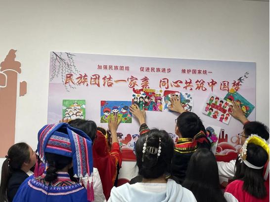 最后,全体党员、社区工作者共同合唱了《爱我中华》这首歌,表达了对祖国的热爱和对民族团结的期盼。并且一起绘制了关于民族团结的画作,并贴在了社区展厅中,共同展示了对民族团结的支持和祝福。