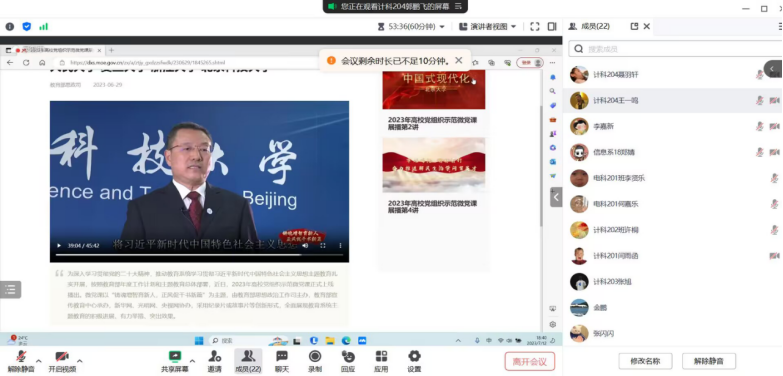 为深入学习贯彻党的二十大精神,推动教育系统学习贯彻习近平新时代中国特色社会主义思想主题教育扎实开展,按照教育部年度工作计划和主题教育总体部署,在2023年7月12日下午6点采用线上集中观看“铸魂增智育新人正风促干书新篇”2023年高校党组织示范微党课。由计电学生党支部书记兰天月主持,支部正式党员全部线上参加。