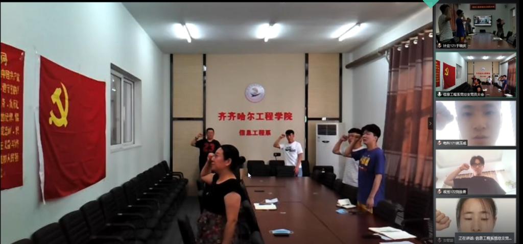 7月2日下午,信息系党总支在一号教学区2406会议室组织“信息工程系党总支党员大会”,举行新党员入党宣誓仪式。仪式由党总支组织委员吴文臣主持,党总支书记任鹏飞、副书记孙晓芳、计算机与电子专业学生党支部书记张雷蕾、视频传达设计专业学生党支部书记辛昊和在校教师党员现场参会,其他党员采取线上方式参加会议。