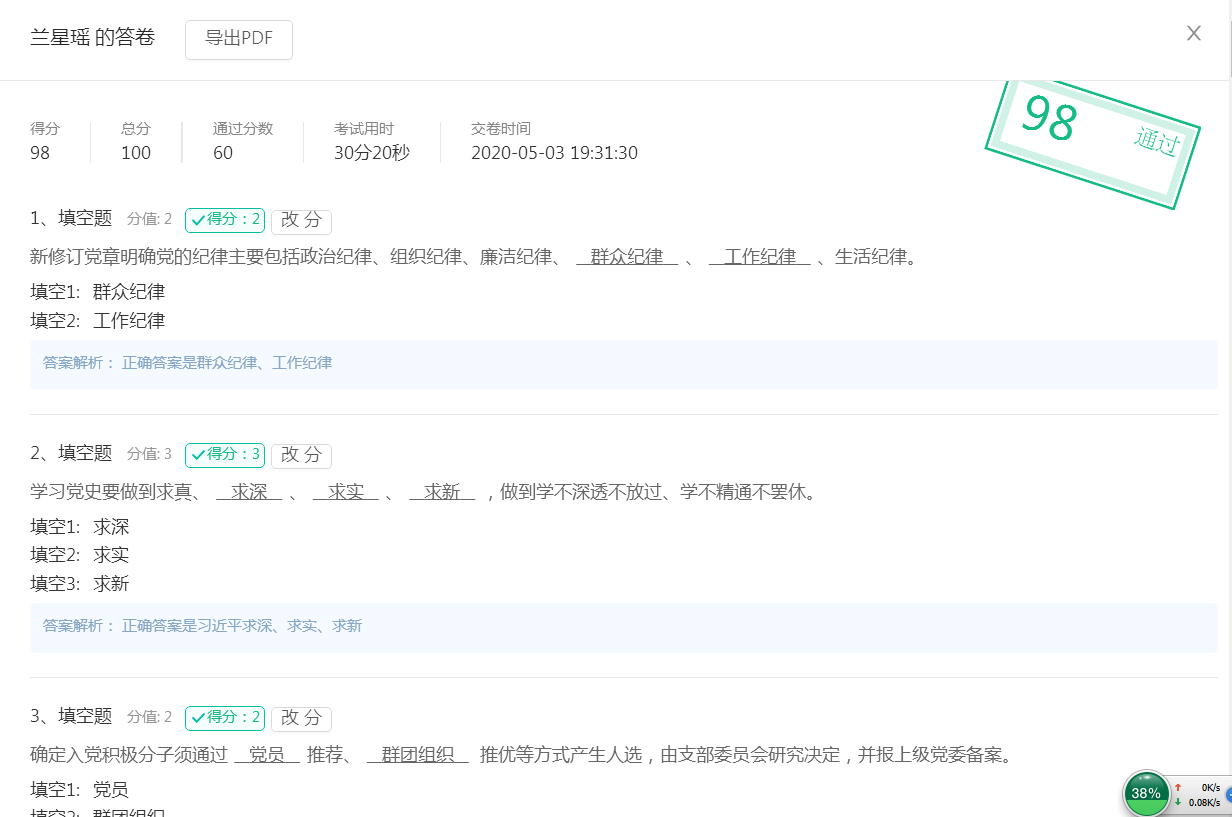 专题讲座环节,针对党史、党章、党员发展流程、习近平讲话、入党誓词有历史沿革、入党动机6个专题,采用钉钉直播的方式,分别由党总支委员及党支部书记进行授课;专题辅导和在线测试两个环节,由学院党委组织部依托学院网站在线学习平台进行,为保障学习效果,要求每名参训人员及时提交学习体会;交流研讨环节,采用钉钉直播形式,分别由两个学生党支部书记组织,保证全员参与,达到了交流研讨的效果;实践活动环节,组织了全国哀悼日网上祭奠和参观网上展览馆两项活动,为保证网络环境下活动开展的真实有效,使用钉钉软件“云课党”平台,将实践活动内容设置为培训课程,利用平台数据监控功能,对参训人员参与活动时长和内容进行监督,保证了实践活动效果;结业考试环节,使用钉钉软件“云课党”平台在线考试模块组织,为解决线上考试无人监考考试真实性难保证的难题,采用了短时间、大题量的方法,从考试结果和参考人员反馈看,基本上保证了考试真实有效。
