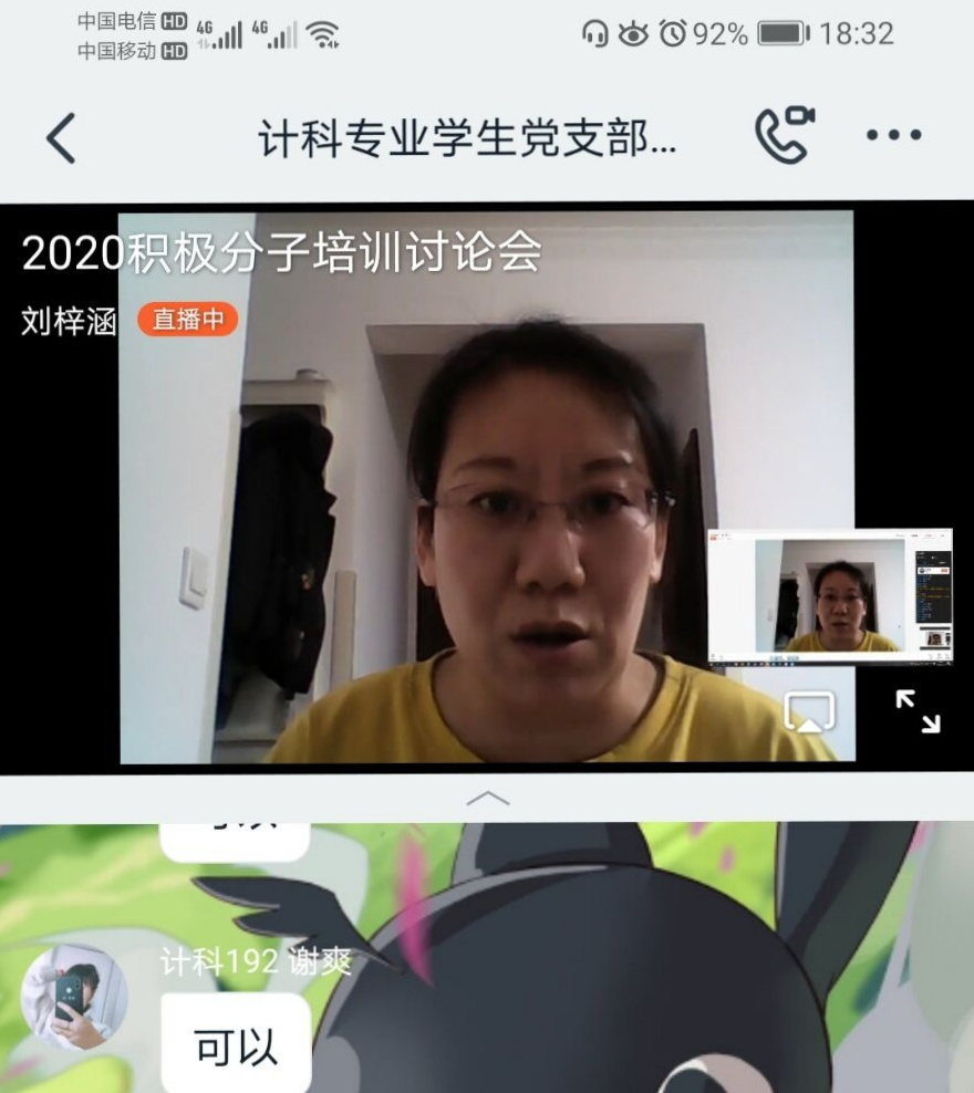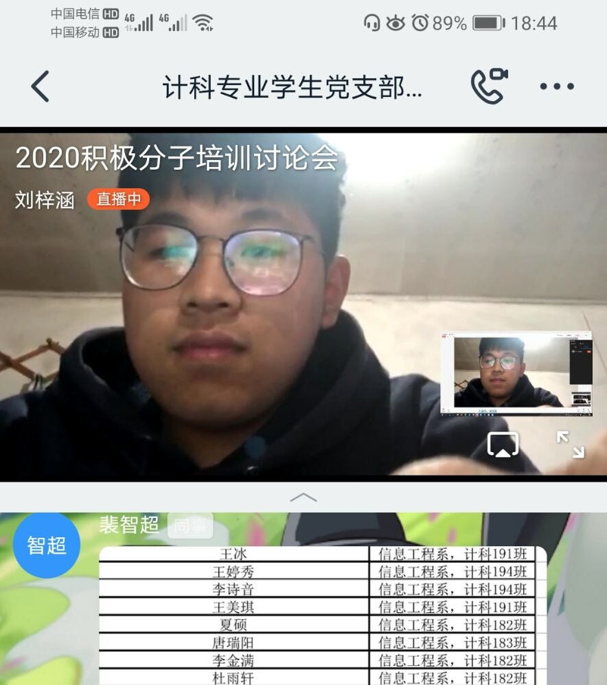 2020年4月16日,信息工程系党总支计算机与电子专业学生党支部采用钉钉直播形式,开展了一次2020积极分子培训讨论会,会议由计算机与电子专业学生党支部副书记刘梓涵主持。