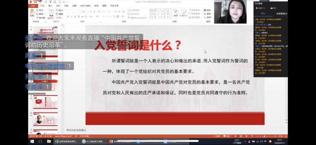 2020年4月13日,信息工程系党总支开展入党积极分子培训—入党誓词的历史沿革,此次培训课由佀冬梅老师担任讲师,共有117人参加此次培训。