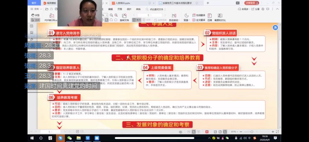 2020年4月9日,信息工程系党总支采用钉钉直播形式,开展了信息工程系党总支2020年度入党积极分子培训的第四课—发展党员流程,本次课程信息工程系计算机与电子专业学生党支部书记张雷蕾老师由主讲。
