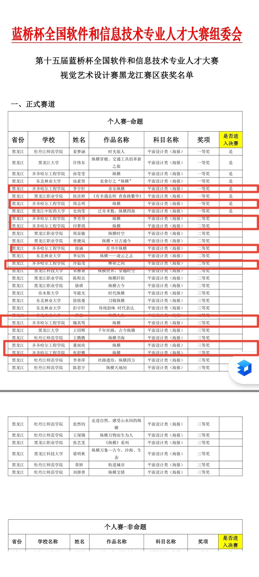 在本次赛事中,孙莹莹、周志明、李宇轩三位同学获得个人赛命题赛道黑龙江赛区一等奖,成功进入国赛。李芳芳、印梦琪、徐涵、冷如茂四位同学获得个人赛命题赛道黑龙江赛区二等奖;隗英莺、董雨欣、张舒雅三位同学获得个人赛命题赛道黑龙江赛区三等奖。另外,周心玉同学获得个人赛非命题赛道黑龙江赛区一等奖,成功进入国赛。刘楠、陶雨晴两位同学获得个人赛非命题赛道黑龙江赛区二等奖,荆晓娜、黄晓蓉、张琦、张紫豪三位同学获得个人赛非命题赛道黑龙江赛区三等奖。共计17位同学在本次赛事中获得奖项。