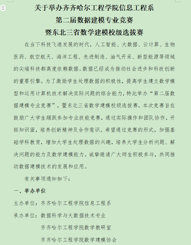 4月20日至5月10日,由齐齐哈尔工程学院信息工程系主办的第二届数据建模专业竞赛暨东北三省数学建模校级选拔赛在我校举行。本次竞赛主题为“智慧未来:数据建模创新挑战”,齐齐哈尔工程学院全校学生全部参加。