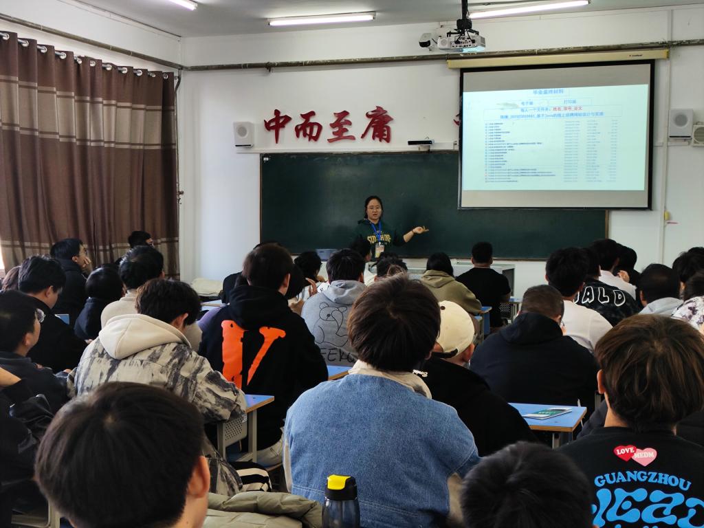 会上,王璐老师详细讲解本科毕业论文工作是本科生培养方案的重要组成部分,是毕业前对学生综合性实践能力和专业素质进行全面考核的一个必要环节。也是培养学生搜集信息、整理信息,信息加工能力的体现。随后,王璐老师讲解了论文真实性的重要性,要学术端正,不得在论文上耍小聪明,要自己独立完成,论文中使用的材料必须真实可靠,论点要站得住脚,有说服力。还讲解了论文选题的一些要求,标题不能过时,标题要言之有理,要有一定的实力深度不能过大,并且要清楚课题的来源、研究目的和意义等,论文要与实物相符。最后,王璐老师对毕业设计中常见的问题进行讲解。