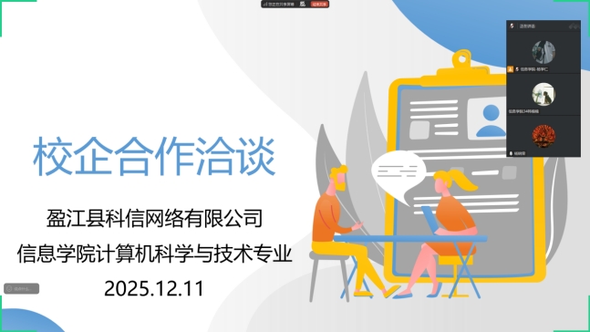 12月11日,为深化产教融合,推动教育链、人才链与产业链精准对接,切实提升计算机科学与技术专业人才培养的针对性和实效性,在李野院长的统筹部署与指导下,计算机科学与技术专业与盈江县科信网络有限公司通过腾讯会议形式成功举办线上校企合作洽谈会。计算机科学与技术专业负责人韩楠楠、教师代表杨学仁,盈江县科信网络有限公司总经理杨钢荣出席会议,双方围绕多元合作模式、人才联合培养等核心议题展开深入交流。